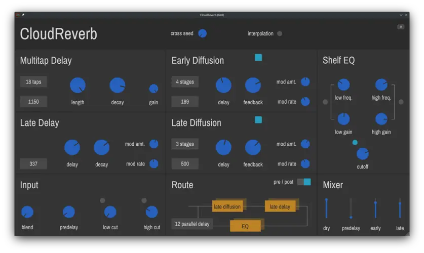 This is an audio plugin for algorithmic reverb. The algorithm is borrowed from CloudSeed VST by Valdemar Erlingsson. I try to rewrite the plugin with JUCE, so it can be also run on Linux and MacOS.