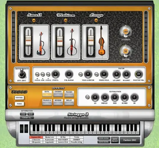 All 3 oscillators can be mixed together into a full strings ensemble, allowing the player to create chords, string sound combinations, articulations and textures. Stringya 2 oscillators have full synthesis sections, 2 different MIDI velocity options, stereo enhancer engine, dedicated gleam effect, global hipass-lopass filter and a full section of built in effects (saturation, chorus, phaser, trance gate, reverb and delay), advanced mono mode and dedicated organs alike drawbars built-in EQ.