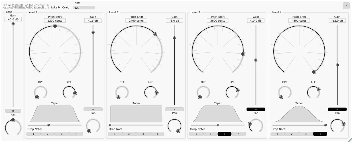 The pitch shift rotary knobs indicate perfect fourth, fifths, and octaves. To snap to these intervals, hold the modifier keys while dragging. Try stacking fourth and fifths or try unison by setting all the knobs to 0. Setting the sliders below 0 will use slightly more processing power. The high-pass and low-pass filters can be useful for putting the different subdivision levels further in the background. The “Drop Note” buttons mute the respective notes from being output (dropping note 4 from Level 2 means that every 4th sixteenth-note becomes a rest).