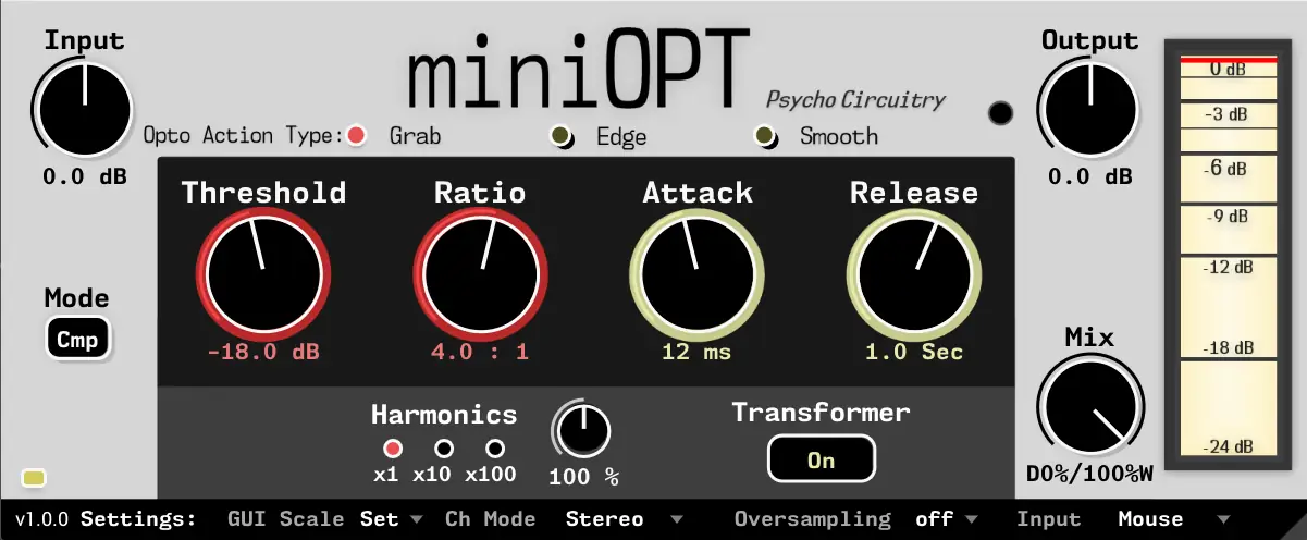 MiniOPT is the little brother to the + version. But it still has plenty to offer: The same 3 action modes, harmonics multipliers and saturation system, oversampling, a switchable transformer output stage. But it only has 1 harmonics mode (natural) and 1 transformer type (modern). It also does not include: external sidechain, variable sidechain filter, LED mode, dual mono channel mode. But it’s the same flexible OPTO compressor in every other way!