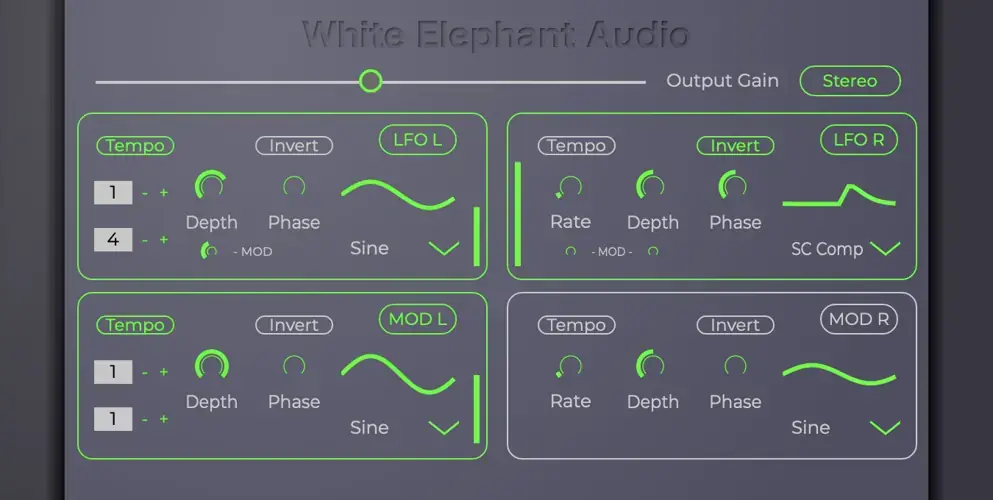 By default the output of both LFOs is multiplied together with the audio, but in stereo mode one LFO will be applied to the left channel and the other to the right.