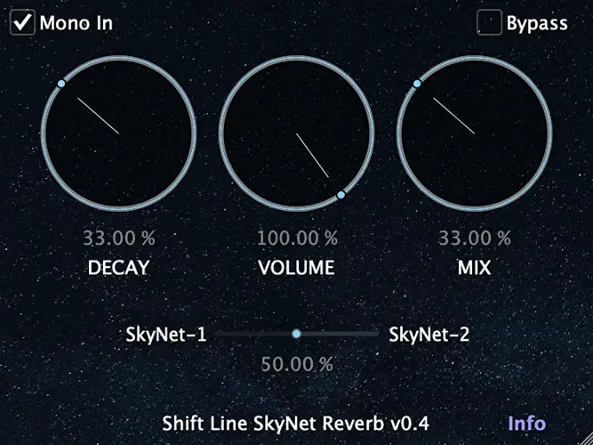 The plugin version is displayed in the Shift Line SkyNet Reverb v.0.1 line. Make sure to check our website for the latest version and any further info by clicking the INFO link in the bottom right corner of the UI.