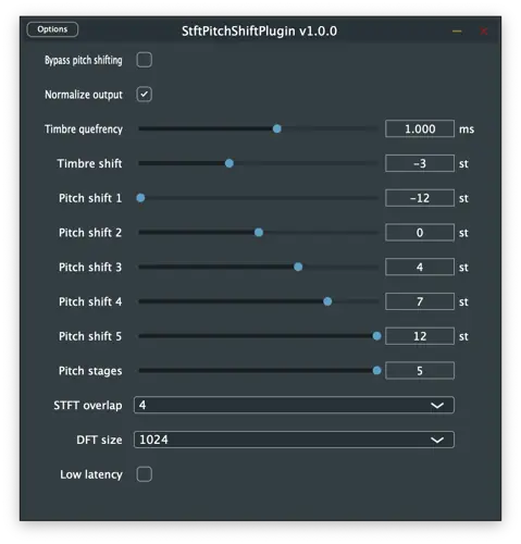 The stftPitchShiftPlugin is available in VST3, AU, LV2 formats as well as a standalone app. It also provides a basic UI to adjust the effect parameters on the fly.